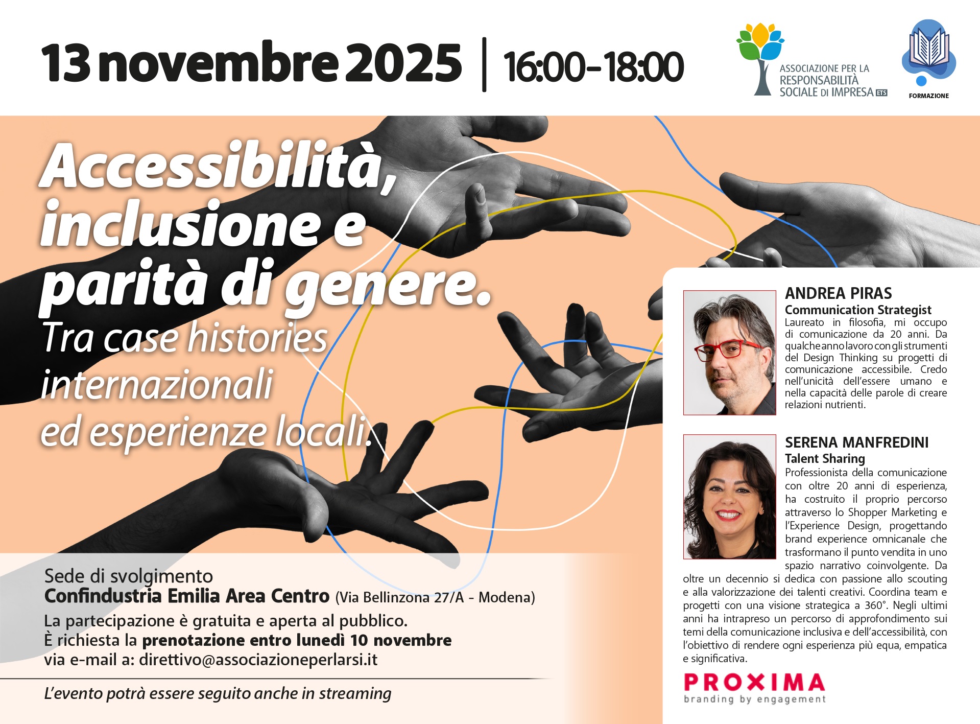 La prossima Pillola Formativa, in programma giovedì 13 novembre 2025 dalle ore 16.00 alle 18.00, sarà dedicata a un tema di grande attualità e rilevanza: accessibilità, inclusione e parità di genere.